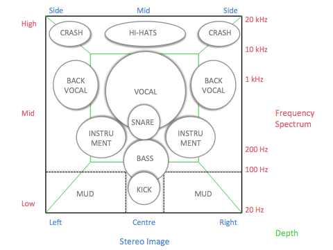 しかし、日本のJ-POPやアニソンなどのジャンルではクラッシュやハイハット、スネア、キックがボーカルに被るように配置されていることが多く、ボーカルがやや遠く感じられたり、音を中央に集めてしまい音どうしが被ることでごちゃごちゃとした印象を受けることがあります。